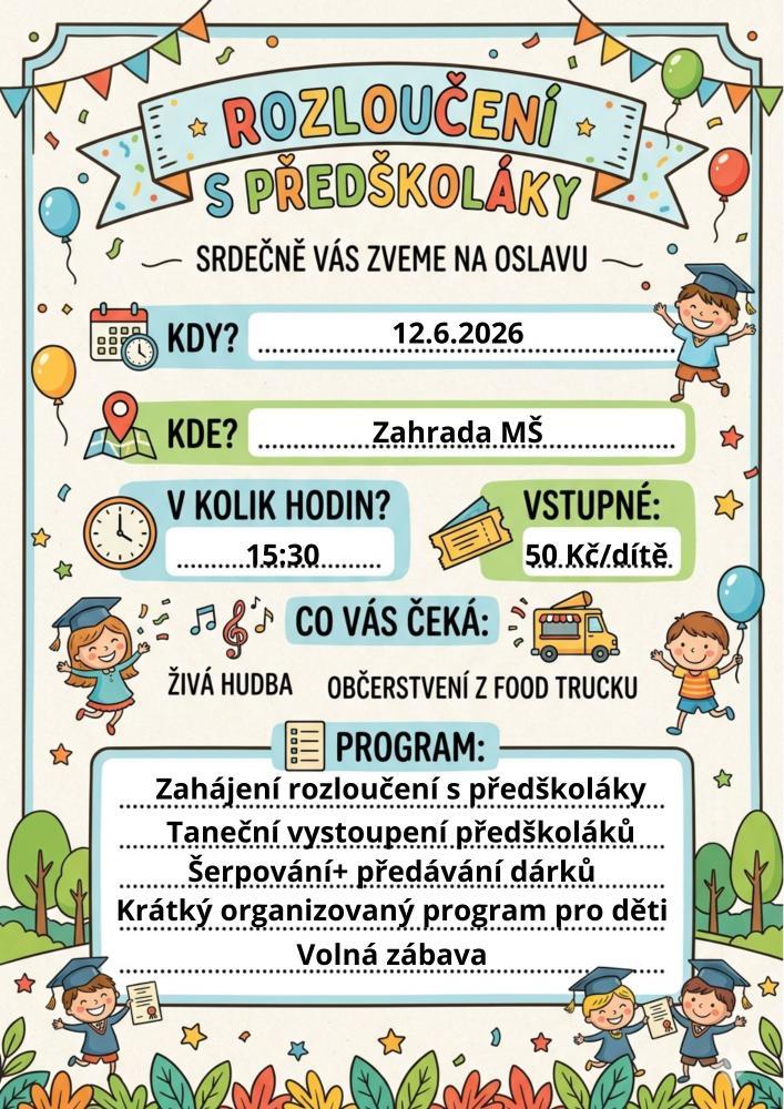 Zveme všechny na zahradní slavnost, která se bude konat na zahradě v MŠ Kosmonautů, dne 12.6. 2026, od 15:30 hodin. Nebude chybět živá hudba v podání dua Renata a Pavel -My2, občerstvení z food trucku, vystoupení předškolních dětí,rozloučení s Pastelkami, volný program pro děti, zdobení obličeje a vlasů. Akce je určena dětem a jejich rodinám z naší MŠ, ale i širší veřejnosti ze sídliště a okolí.Přijďte nás podpořit a pobavit se.Děti z MŠ platí 50 Kč vstupné, ale ostatní z rodiny nic neplatí, mohou přispět dobrovolným vstupným.